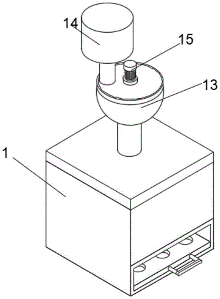 本实用新型的进一步设置为:所述调节球的内部设置有空腔,所述调节球的内壁固定连接有电机,所述电机的输出端固定连接有转轴,所述转轴的另一端固定连接有扫架,所述扫架的外表面与调节球转动连接。The utility model is further set as: the interior of the adjusting ball is provided with a cavity, the inner wall of the adjusting ball is fixedly connected with a motor, the output end of the motor is fixedly connected with a rotating shaft, and the other end of the rotating shaft is fixedly connected with a The sweeping frame, the outer surface of the sweeping frame is rotatably connected with the adjusting ball.