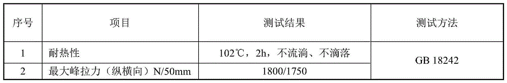 As can be seen by comparison, the high polymer film base modified asphalt waterproof coiled material has excellent mechanical properties, and the mechanical properties of the coiled material with the thickness of 2mm can meet the mechanical property requirements of the coiled material with the thickness of 3mm with the traditional polyester tire base. Under the condition of the same thickness, the modified asphalt coating material is firmly bonded with the polymer film base, the high-temperature performance is superior to that of the self-adhesive modified asphalt waterproof coiled material, the mechanical performance is superior to that of the polyester tire base modified asphalt waterproof coiled material, and the modified asphalt waterproof coiled material can be applied to the fields with high requirements on mechanical performance, such as roads, railways and the like, and the application field of the modified asphalt waterproof coiled material is expanded.