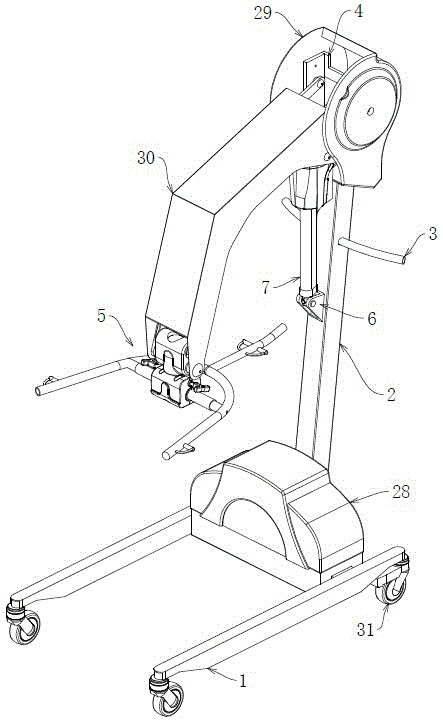 图示说明:1-底座,2-立柱,3-推拉杆,4-机架,5-训练机构,6-支撑座,7-驱动组件,8-支撑连杆,9-被动连杆,10-加强杆,11-连接杆,12-联动块,13-扶手组件,14-铰接柱,15-转动座,16-转动轴,17-限位块,18-扶手架,19-挡杆,20-固定套筒,21-转动柱,22-调节齿轮,23-箱体,24-柱体,25-轴承座,26-调节杆,27-定位块,28-配重箱,29-第一防护罩,30-第二防护罩,31-万向轮。Illustration: 1-base, 2-column, 3-push-pull rod, 4-rack, 5-training mechanism, 6-support base, 7-drive assembly, 8-support link, 9-passive link, 10 -Strengthening rod, 11-connecting rod, 12-link block, 13-handrail assembly, 14-hinged column, 15-rotating seat, 16-rotating shaft, 17-limiting block, 18-armrest frame, 19-stop rod, 20-fixed sleeve, 21-rotating column, 22-adjusting gear, 23-box, 24-cylinder, 25-bearing seat, 26-adjusting rod, 27-positioning block, 28-counterweight box, 29-first Protective cover, 30-second protective cover, 31-universal wheel.