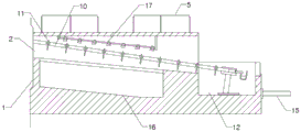 Wherein: 1. a cleaning table; 2. a flushing box; 3. an oven; 4. an air heater; 5. flushing a pump machine; 6. a motor mounting groove; 7. a motor; 8. a front support shaft; 9. a belt wheel; 10. a transmission belt; 11. a hook; 12. a water tank; 13. a rear support shaft; 14. a first drain pipe; 15. a second drain pipe; 16. a water storage tank; 17. a flushing pipe; 18. and (5) an air plate.