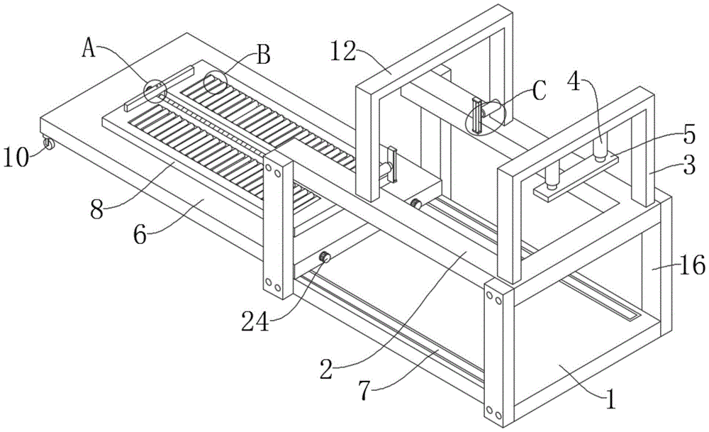 1、底座;2、U凹板;3、架框;4、压持液压杆;5、压板;6、位移板;7、直线电机;8、升降板;9、推板;10、万向轮;11、减阻辊;12、限位框;13、夹持液压杆;14、夹板;15、夹辊;16、连接柱;18、空腔;19、直腔;20、凹处;1. Base; 2. U concave plate; 3. Frame; 4. Pressing hydraulic rod; 5. Pressing plate; 6. Displacement plate; 7. Linear motor; 8. Lifting plate; 9. Pushing plate; 10. Universal Wheel; 11. Drag reduction roller; 12. Limit frame; 13. Clamping hydraulic rod; 14. Plywood; 15. Nip roller; 16. Connecting column; 18. Cavity; 19. Straight cavity; 20. Recess;