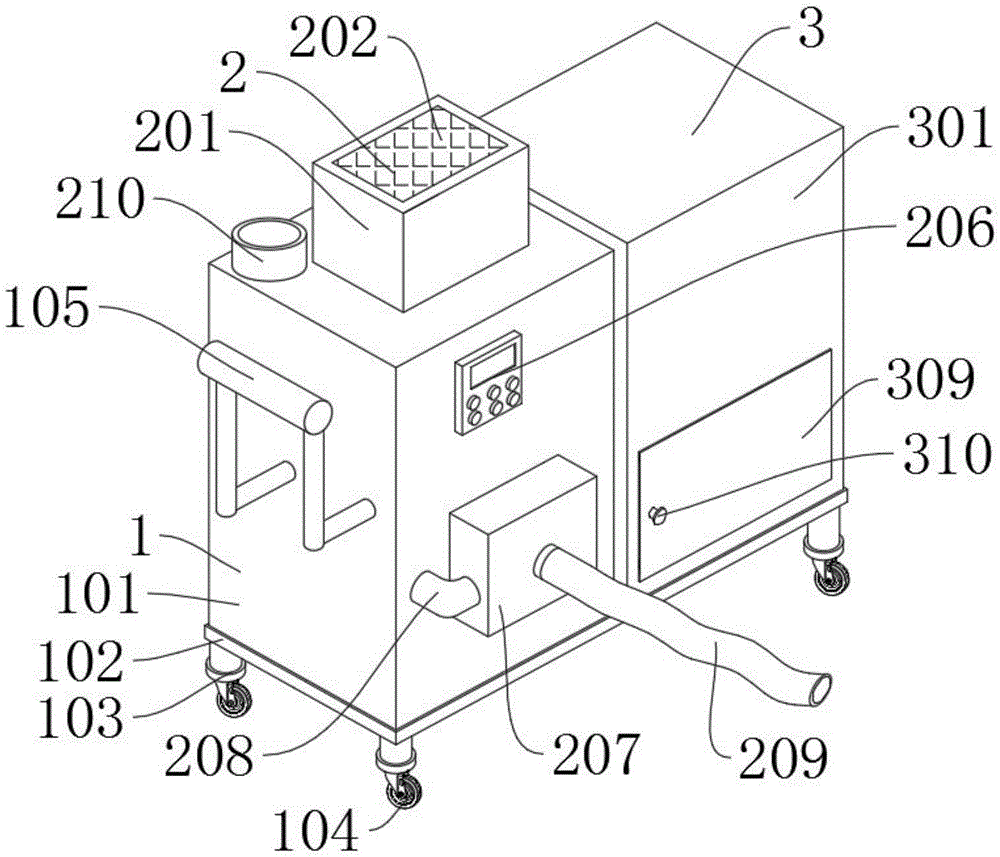 图中:1、主体机构;101、储料箱;102、承重底座;103、支撑腿;104、万向轮;105、手推把;2、搅拌浇灌机构;201、电机防护罩;202、散热网孔;203、驱动电机;204、转动轴;205、搅拌叶片;206、操控面板;207、泥浆泵;208、抽浆管;209、灌缝管;210、进料口;3、清理机构;301、集尘箱;302、安装支架;303、吸风电机;304、传动轴;305、吸风叶片;306、过滤网;307、吸尘口;308、单向电磁阀;309、箱门;310、门把手。In the figure: 1. Main mechanism; 101, material storage box; 102, load-bearing base; 103, support leg; 104, universal wheel; 105, hand push handle; 2, mixing and pouring mechanism; Heat dissipation mesh; 203, driving motor; 204, rotating shaft; 205, stirring blade; 206, control panel; 207, mud pump; 208, pumping pipe; 209, filling pipe; 210, feed port; Mechanism; 301, dust collection box; 302, mounting bracket; 303, suction motor; 304, transmission shaft; 305, suction blade; 306, filter screen; 307, dust suction port; Box door; 310, door handle.