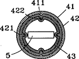 See also Fig. 4-1,4-2 and Fig. 5, they are respectively that handle rack of the present utility model vertically reaches top plan view.Handle rack 4 shown in the figure is nested with by three hollow levers, be bottom bar 41 wherein in outermost, be king-rod 42 and interior bar 43 more in regular turn, and be respectively equipped with a sliver 411 with two positions of justifying branches in the inner edge of bottom bar 41, and offer two rail grooves 421 symmetrical, and be provided with the bottom dead centre of a brake block 423 when placing as king-rod 42 in king-rod 42 1 side upper limbs with sliver 411 in the outer rim of the king-rod 42 that is nested with.And in 42 of bottom bar 41 and king-rods, by 5 blockings of the shell fragment in the locating hole that both are provided with 412,425, so it forms blocking by fastening part 51 in locating hole 412,425.Be provided with the corresponding sliver 422 of four circle branches in king-rod 42 inner edges in addition, import for the rail groove 431 of interior bar in 43 outer rims.