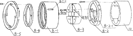 As shown in Figure 1, the utility model the utility model steel bar rib-stripping screw-rolling machine, comprise fuselage 1, power set 2, travel control device 3, cooling device 4, go up retraction mechanism 5, limit switch 6 and reinforcing-bar clamping machine structure 7, it also comprises ripping rib and rolling depressing head unit 8 and rolled thread device; As shown in Figure 2, the rolled thread device is installed on the ripping rib and rolling depressing head unit by rolled thread working range circle 10, described ripping rib and rolling depressing head comprises stripping rib work flange 8-1, by rib peeling knife frame bearing fixed disk 8-2 rib peeling knife frame bearing 8-3 is fixed on the stripping rib work flange, by rib peeling knife frame bearing rib peeling knife is installed, built-in locking stopper ring 8-4 is equipped with involute-type position-arresting disk 8-5 by stripping rib work flange, making on the position-arresting disk has four arcwall faces, and the arcwall face by position-arresting disk contacts with rib peeling knife frame rear arc face.
