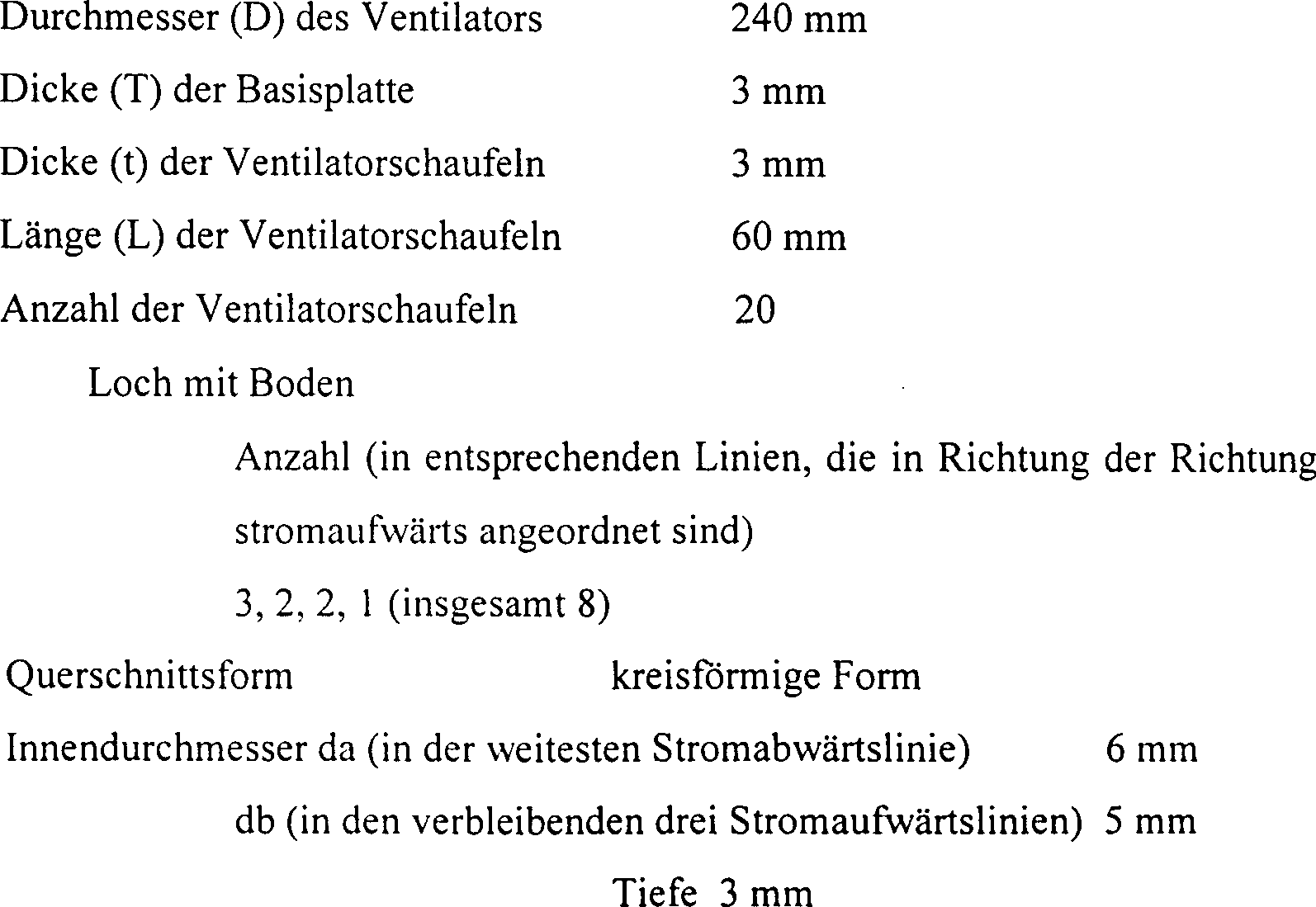 • Dieses Loch wurde angefertigt, um die Befestigung eines Klebebandes auf der Bodenoberflä che des Ventilators in dem erfinderischen Beispiel, um die Böden der durchgehenden Löcher zu schließen. Aufbau des Ventilators (herkömmlicher Ventilator ohne Loch) Vergleichsbeispiel 2