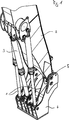 Zum Bewegen des bewegbaren Elementes 2 sind dabei zwei Arbeits-Hydraulikzylinder 1 vorgesehen, welche über entsprechende Anlenkpunkte am bewegbaren Element 2 sowie an der Schweißkonstruktion 4 des Oberwagens angelenkt sind. Weiterhin ist ein Ausführungsbeispiel eines erfindungsgemäßen Energierückgewinnungszylinders 3 vorgesehen, welcher wie die Arbeits-Hydraulikzylinder 1 zwischen dem bewegbaren Element 2 und dem Oberwagen des Arbeitsgerätes 4 angeordnet ist und der Energierückgewinnung aus der Bewegung des bewegbaren Elements dient. Der Energierückgewinnungszylinder 3 ist dabei zwischen den beiden Arbeits-Hydraulikzylindern 1 angeordnet.