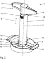 Der Betätigungs-Griff 3 weist zwei bezüglich der Längs-Achse 2 diametral angeordnete und radial von der Längs-Achse 2 sich erstreckende Griff-Flügel 9 auf, die die Beaufschlagung des Ananas-Schneiders 1 mit einem Drehmoment um die Längs-Achse 2 und mit einer Normalkraft entlang der Längs-Achse 2 ermöglichen. An einem unteren, in 1 dem Halte-/Führungs-Element 6 zugewandten Ende, weist der Betätigungs-Griff 3 zwei entlang der Längs-Achse 2 orientierte Rast-Elemente 10 auf. Die Rast-Elemente 10 dienen zum verrastenden Anordnen in den dazu korrespondierenden Rast-Ausnehmungen 11 des Halte-/Führungs-Elements 6. In der in 2 und 3 dargestellten, montierten Anordnung des Ananas-Schneiders 1 sind die Rast-Elemente 10 in der jeweiligen Rast-Ausnehmung 11 angeordnet. Dabei sind die Rast-Elemente 10, die im Wesentlichen rechteckförmig oder trapezförmig ausgeführt sind, umfänglich in der Rast-Ausnehmung 11 gehalten, so dass sowohl eine Verdrehung des Betätigungs-Griffs 3 um die Längs-Achse 2 als auch dessen Verlagerung entlang der Längs-Achse 2 relativ zu dem Halte-/Führungs-Element 6 verhindert ist. Die verrastenden Anordnung des Betätigungs-Griffs 3 an dem Halte-/Führungs-Element 6 ermöglicht eine schnelle, unkomplizierte und gleichzeitig sichere Verbindung des Betätigungs-Griffs 3 mit dem Halte-/Führungs-Element 6. Die Rast-Elemente 10 und entsprechend die Rast-Ausnehmungen 11 sind bezüglich der Längs-Achse 2 diametral angeordnet.