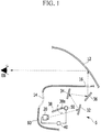 1 und 2 sind beispielhafte schematische Darstellungen der Anzeigevorrichtung für ein Fahrzeug gemäß einem Ausführungsbeispiel der vorliegenden Erfindung. 3 ist eine beispielhafte schematische Darstellung einer Laserscanprojektionsvorrichtung gemäß einem Ausführungsbeispiel der vorliegenden Erfindung. Über die gesamte Beschreibung ist eine Horizontalachse einer Bildausgabe der Laserscanprojektionsvorrichtung 20 als eine X-Achse bezeichnet und die Vertikalachse des Bildes ist als eine Y-Achse angegeben. Bilder, die auf einer ersten gewölbten Scheibe 12 angezeigt werden, sind durch gepunktete Linien in 1 dargestellt, und Bilder, die auf einer zweiten gewölbten Scheibe 14 dargestellt werden, sind durch Strichpunktlinien in 2 dargestellt.