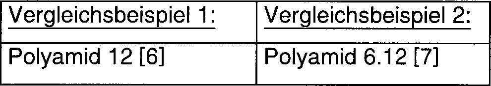 - [7] Polyamid 6.12 im Vergleichsbeispiel 2: Schmelzpunkt: 215°C, spezifische Dichte: 1,06 [g/cm3], Zug-E-Modul: 2100 [MPa], Wasseraufnahme: 23°C/Sättigung 2.8%, mittelviskos
