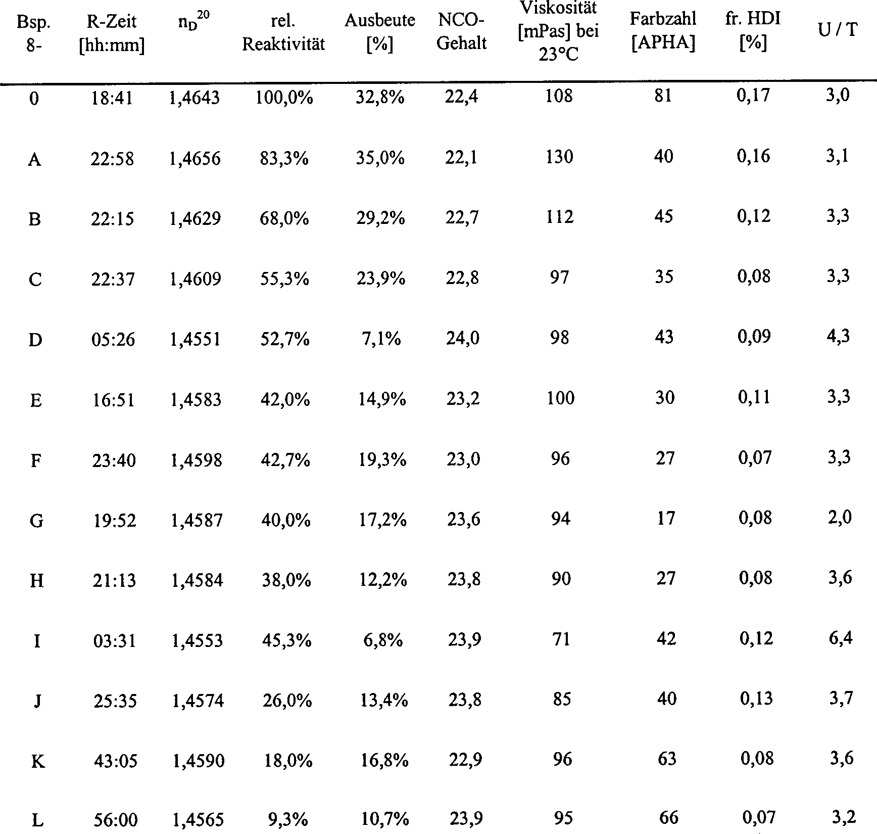 • DE-A 1 670 720 offenbart die Herstellung von Uretdiongruppen aufweisenden aliphatischen Polyisocyanaten, wobei als Katalysatoren tertiäre Phosphine mit mindestens einem aliphatischen Substituenten sowie Bortrifluorid und seine Addukte eingesetzt werden. Es wird darauf hingewiesen, dass nur bei niedrigen Umsätzen und Reaktionstemperaturen zwischen 50 und 80°C hohe Anteile an Uretdiongruppen im Produkt erhalten werden können, wobei gleichzeitig Isocyanat-Trimere (Isocyanurate und Iminooxadiazindione) und, insbesondere bei höherer Temperatur, auch andere Nebenprodukte wie Carbodiimide oder Uretonimine gebildet werden. Uretonimine sind ganz besonders störend, da sie bei Lagerung zur Freisetzung von monomerem Isocyanat neigen.
