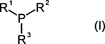 • Beispiele erfindungsgemäß einzusetzender Phosphine sind: Norbornyl-dimethylphosphin, Norbornyl-diethylphosphin, Norbornyl-di-n-propylphosphin, Norbornyl-di-isopropylphosphin, Norbor nyl-dibutylphosphin wobei 'Butyl' für alle Isomeren, d.h. n-Butyl, iso-Butyl, 2-Butyl, tert.-Butyl sowie cyclo-Butyl stehen kann, Norbornyl-dihexylphosphin (alle isomeren Hexylreste), Norbornyl-dioctylphosphin (alle isomeren Octylreste), Dinorbornyl-methylphosphin, Dinorbornyl-ethylphosphin, Dinorbornyl-n-propylphosphin, Dinorbornyl-isopropylphosphin, Dinorbornyl-butylphosphin (alle isomeren Butylreste), Dinorbornyl-hexylphosphin (alle isomeren Hexylreste), Dinorbornyl-octylphosphin (alle isomeren Octylreste), Trinorbornylphosphin, Dimethyl-(1,7,7-trimethyl-bicyclo[2.2.1]hept-2-yl)-phosphin, Diethyl-(1,7,7-trimethyl-bicyclo[2.2.1]hept-2-yl)-phosphin, Di-n-propyl-(1,7,7-timethyl-bicyclo[2.2.1]hept-2-yl)-phosphin, Di-iso-propyl-(1,7,7-trimethyl-bicyclo[2.2.1]hept-2-yl)-phosphin, Dibutyl-(1,7,7-timethyl-bicyclo[2.2.1]hept-2-yl)-phosphin (alle isomeren Butylreste), Dihexyl-(1,7,7-timethyl-bicyclo[2.2.1]hept-2-yl)-phosphin (alle isomeren Hexylreste), Dioctyl-(1,7,7-timethyl-bicyclo[2.2.1]hept-2-yl)-phosphin (alle isomeren Octylreste), Methyl-bis-(1,7,7-trimethyl-bicyclo[2.2.1]hept-2-yl)-phosphin, Ethyl-bis-(1,7,7-timethyl-bicyclo[2.2.1]hept-2-yl)-phosphin, n-Propyl-bis-(1,7,7-timethyl-bicyclo[2.2.1]-hept-2-yl)-phosphin, iso-Propyl-bis-(1,7,7-trimethyl-bicyclo[2.2.1]hept-2-yl)-phosphin, Butyl-bis-(1,7,7-timethyl-bicyclo[2.2.1]hept-2-yl)-phosphin (alle isomeren Butylreste), Hexyl-bis-(1,7,7-trimethyl-bicyclo[2.2.1]hept-2-yl)-phosphin (alle isomeren Hexylreste), Octyl-bis-(1,7,7-trimethyl-bicyclo[2.2.1]hept-2-yl)-phosphin (alle isomeren Octylreste), Dimethyl-(2,6,6-timethyl-bicyclo-[3.1.1]hept-3-yl)-phosphin, Diethyl-(2,6,6-trimethyl-bicyclo[3.1.1]hept-3-yl)-phosphin, Di-n-propyl-(2,6,6-trimethyl-bicyclo[3.1.1]hept-3-yl)-phosphin, Di-iso-propyl-(2,6,6-timethyl-bicyclo-[3.1.1]hept-3-yl)-phosphin, Dibutyl-(2,6,6-timethyl-bicyclo[3.1.1]hept-3-yl)-phosphin (alle isomeren Butylreste), Dihexyl-(2,6,6-timethyl-bicyclo[3.1.1]hept-3-yl)-phosphin (alle isomeren Hexylreste), Dioctyl-(2,6,6-timethyl-bicyclo[3.1.1]hept-3-yl)-phosphin (alle isomeren Octylreste), Methyl-bis-(2,6,6-trimethyl-bicyclo[3.1.1]hept-3-yl)-phosphin, Ethyl-bis-(2,6,6-trimethyl-bicyclo[3.1.1]hept-3-yl)-phosphin, n-Propyl-bis-(2,6,6-timethyl-bicyclo[3.1.1]hept-3-yl)-phosphin, iso-Propyl-bis-(2,6,6-timethyl-bicyclo[3.1.1]hept-3-yl)-phosphin, Butyl-bis-(2,6,6-trimethyl-bicyclo[3.1.1]hept-3-yl)-phosphin (alle isomeren Butylreste), Hexyl-bis-(2,6,6-trimethyl-bicyclo[3.1.1]hept-3-yl)-phosphin (alle isomeren Hexylreste), sowie Octyl-bis-(2,6,6-trimethyl-bicyclo[3.1.1]hept-3-yl)-phosphin (alle isomeren Octylreste).