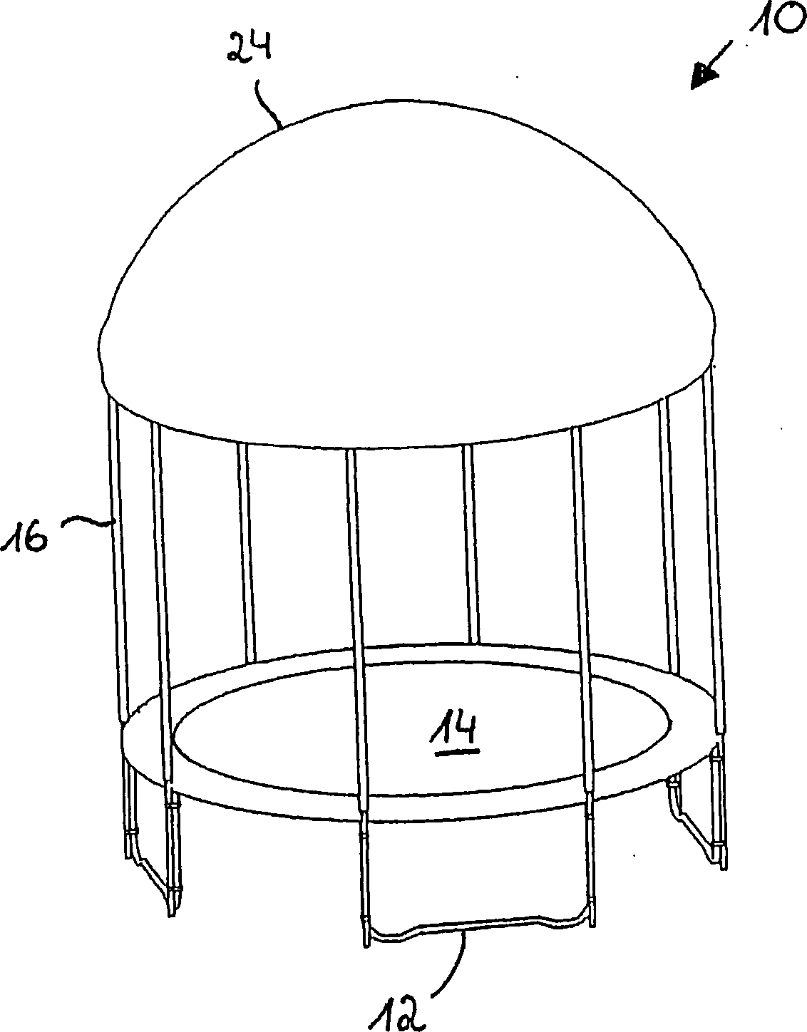 Es ist daher Aufgabe der vorliegenden Erfindung, ein Trampolin bereitzustellen, welches einem Trampolinutzer im Freien Schutz vor unerwünschten Umwelteinflüssen bietet, insbesondere vor Niederschlag oder/und starker Sonneneinstrahlung.It It is therefore an object of the present invention to provide a trampoline, which offers a trampoline user outdoor protection against unwanted environmental influences, especially from precipitation and / or strong sunlight.