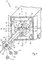 Die an der Schubstange 11 angeordnete Verbindungseinrichtung 39 ist mit der Einhängevorrichtung 40, die am freien Ende des teleskopartigen Schiebearms 41 angeordnet ist, verbunden. Der Schiebearm 41 kann bis zu einer Länge von max. 30 m ausgefahren werden. Daher ist an jedem Metallarm 14, 15, 16, 17 des Metallkreuzes 9 zur Führung der Vorrichtung 1 ein Stützrad 62 angeorddnet. Der ein- und ausfahrbare Schiebarm 41, der Bestandteil einer stationären Maschine 42 ist, wird von einem Hydraulikmotor 51 angetrieben. Der Hydraulikmotor 51 stellt auch die Versorgung der Antriebsmotoren 26, 27, 28, 29 und der hydraulischen Zylinder 18, 19, 20, 21 an der Vorrichtung 1 sicher. Der Wasseranschluss 52 für die Wasserversorgung beim Reinigungsvorgang erfolgt über einen externen Anschluss. Die stationäre Maschine 42 befindet sich auf einer Rampe 50, damit die Längsachse 53 des Schiebarms 41 die gleiche Höhe zum Boden 54 aufweist wie die Achse 12 der Schubstange 11. Vorteilhafterweise ist die Maschine 42 auf einer axial verschiebbaren Unterlage 55 und einem Drehteller 56 angeordnet. Die axiale Unterlage 55 ist in Querrichtung des Containers 3 verschiebbar, wodurch die angeflanschte Vorrichtung 1 zur Längsachse 53 des Innenraumes 58 des Containers 3 auf gleicher Höhe in paralleler Richtung ausgerichtet werden kann. Um auch eine Winkelabweichung zwischen den beiden Längsachsen 57 des Innenraumes und der Längsachse 53 des Schiebearmes 41 auszugleichen, kann der Drehteller 56 benutzt werden. Ist die Maschine 42 mit der angeflanschten Reinigungsvorrichtung 1 ausgerichtet, kann der Reinigungsprozess erfolgen.