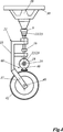 Die Lenkeinrichtung 21 ist um die vertikale Drehachse 28 schwenkbar und in der Traverse 9 bzw. den unmittelbar darunter angrenzenden Bauteilen und der Querstange 16 gelagert. Von der Drehachse 28 erstreckt sich ein F-förmiger Ausleger 35 mit einer Radgabel 37. Die freien Enden der Radgabel 37 sind von der Radachse 40 durchsetzt und in der Radgabel 37 gelagert.