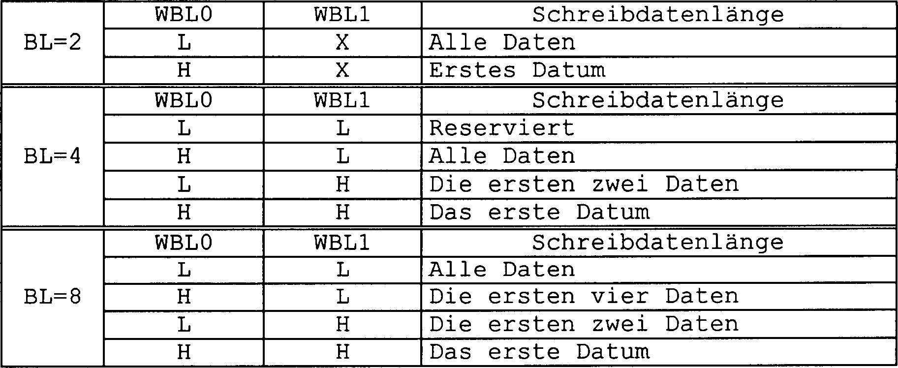 • Bei einem Verfahren zum Betreiben einer Halbleiterspeichervorrichtung, das die vorliegende Erfindung verkörpert, wird ein Signal, das einem vorbestimmten Anschluß zugeführt wird, vorzugsweise als Informationen zum Spezifizieren der Länge von Schreibdaten akzeptiert, wenn der durch den zweiten Befehl bestimmte Operationsmodus der Schreiboperationsmodus ist. Vorzugsweise wird die Länge von Schreibdaten auf der Basis der akzeptierten Informationen direkt gesteuert. Falls eine Vielzahl von Daten in Folge von einem Eingangs-/Ausgangsanschluß (von Eingangs-/Ausgangsanschlüssen) während der Schreiboperation akzeptiert wird, ist es daher möglich, die Länge von akzeptierten Daten bei den einfachen Steuerprozeduren zu verändern. In bezug auf Daten, die nicht geschrieben zu werden brauchen (das heißt, ein Abschnitt, der länger als die spezifizierte Datenlänge ist), ist zusätzlich keine Schreibsteuerung erforderlich. Dadurch wird Zeit eingespart, die zum Steuern der Schreiboperation benötigt wird. Daher ist es möglich, eine Eingabezeitlage des ersten Befehls im nächsten Zyklus früher anzuordnen. Die Länge von Schreibdaten kann nur durch die Steuerung der Eingangs-/Ausgangsschaltungen verändert werden, so daß die Steuerung durch das Akzeptieren von Informationen zusammen mit dem zweiten Befehl zuverlässig ausgeführt werden kann.