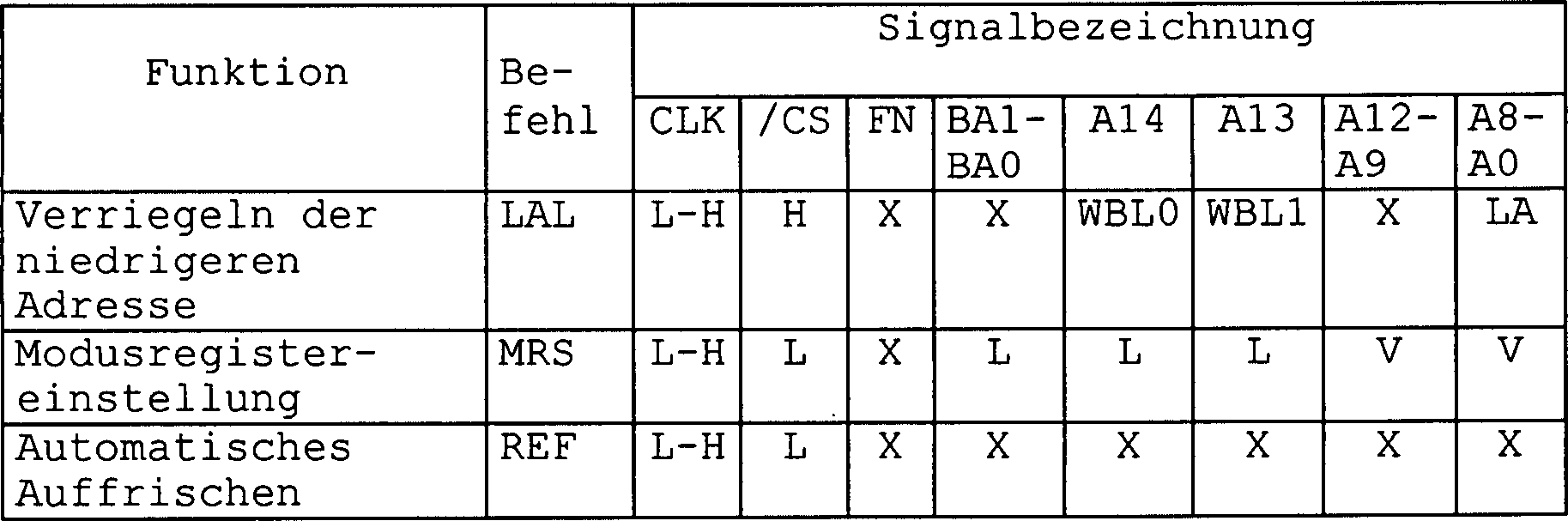 • Bei einem Verfahren zum Steuern einer Halbleiterspeichervorrichtung, das die vorliegende Erfindung verkörpert, ist es vorzugsweise unnötig, Informationen zum Einstellen des Modusregisters zusammen mit dem ersten Befehl von einem Adressenanschluß zu akzeptieren. Deshalb ist es in diesem Fall unnötig, die Informationen zu halten, bis der zweite Befehl zugeführt wird; als Resultat ist es möglich, die Komplikation einer Steuerschaltung zu verhindern.