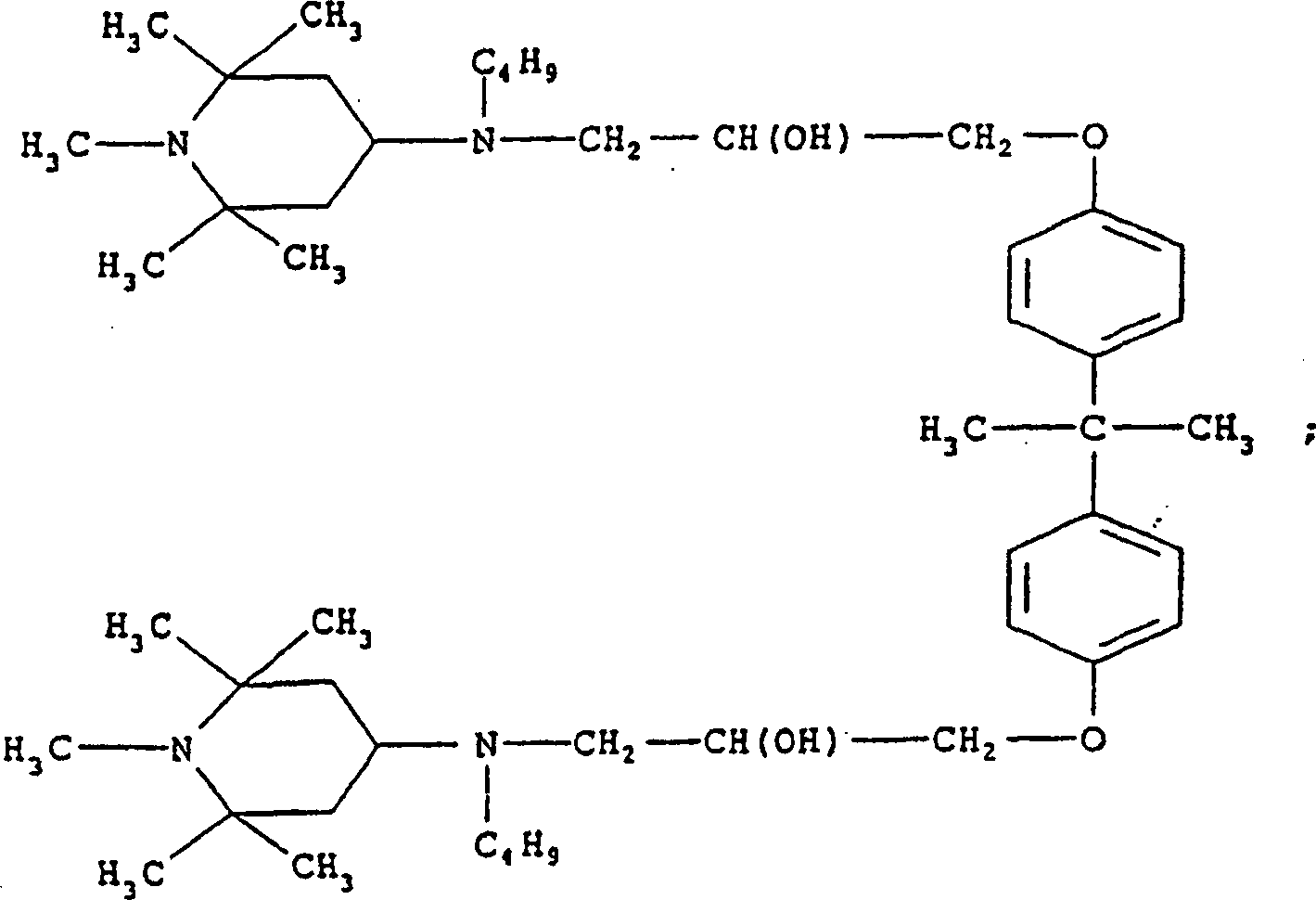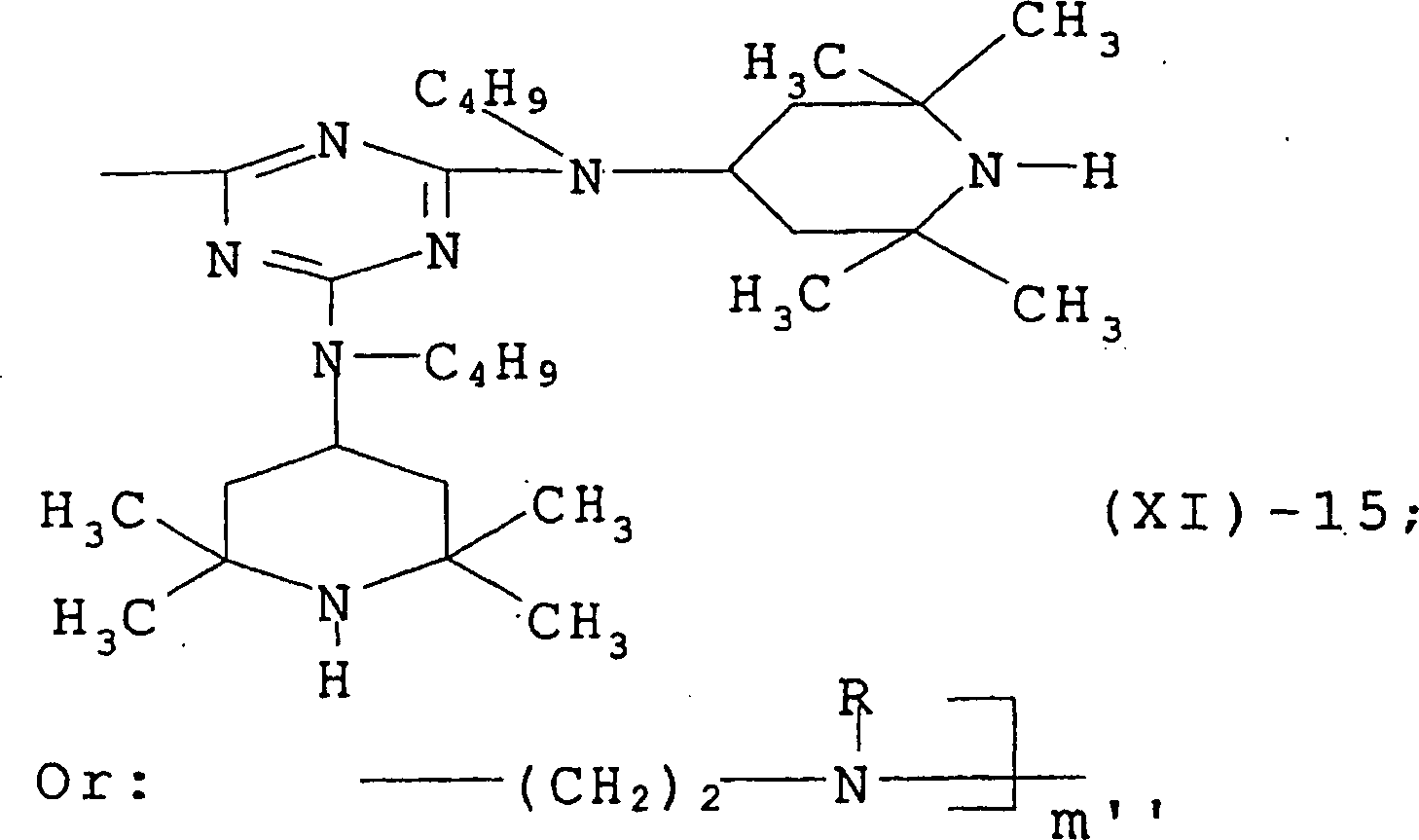 worin R1 für eine C1-C10 Alkylgruppe, eine C5-C12 Cycloalkylgruppe, gegebenenfalls mit einer C1-C4 Alkylgruppe substituiert, ein Phenyl, gegebenenfalls mit einer C1-C10 Alkylgruppe substituiert, steht; R2 für eine C3-C10 Alkylengruppe steht; R3 für ein Wasserstoff, eine C1-C8 Alkylgruppe, 0, eine -CH2CN-Gruppe, eine C3-C6 Alkenylgruppe, eine C7-C9 Phenylalkylgruppe, gegebenenfalls am Phenylrest mit einer C1-C4 Alkylgruppe substituiert, eine C1-C8 Acylgruppe steht; und n1 für eine Zahl zwischen 1 und 15 steht, einschließlich der Grenzen.