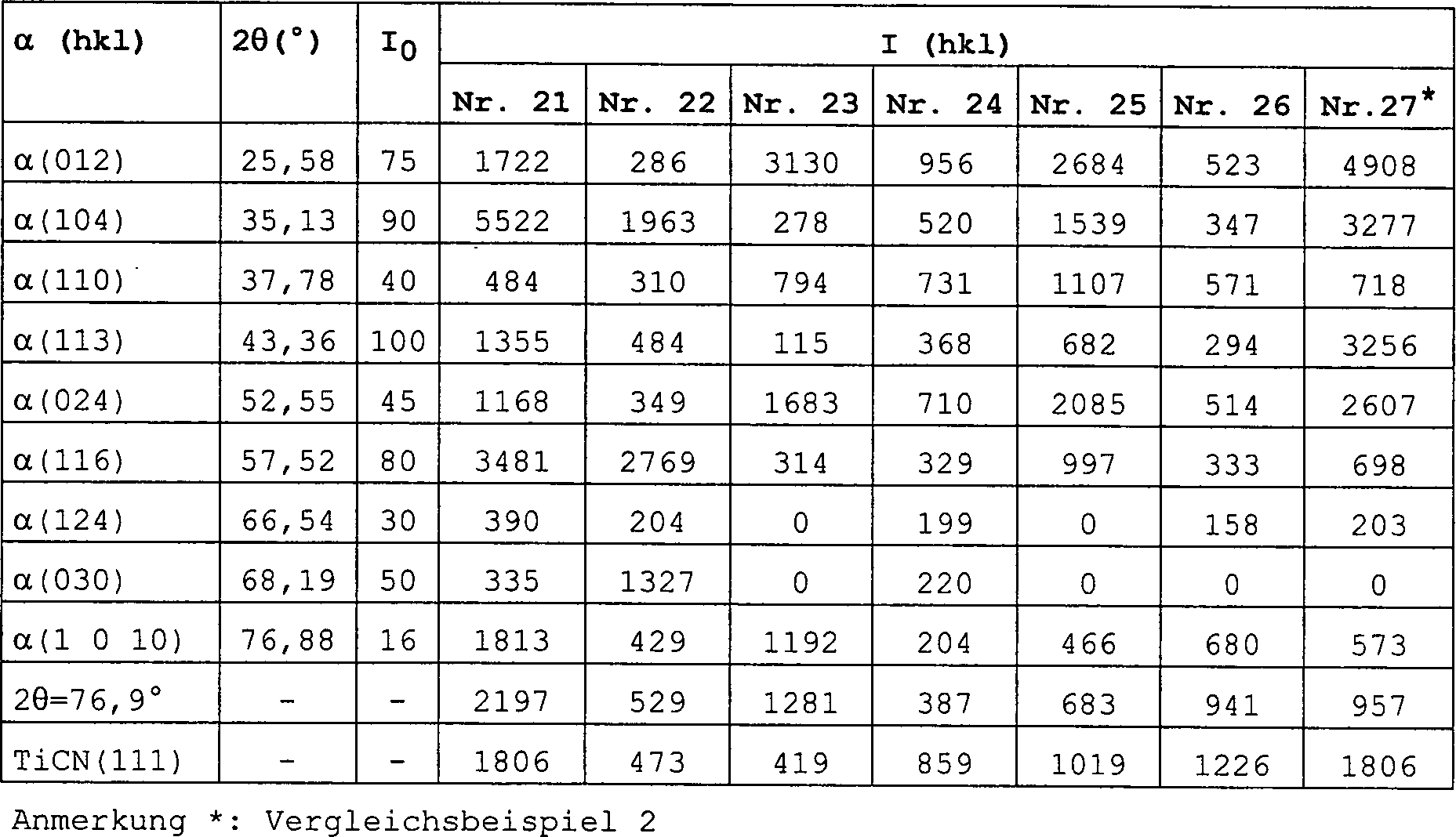 • In Bezug auf den Zusammenhang zwischen der Kristallorientierung von α-Aluminiumoxidschichten und den Schneideeigenschaften von mit derartigen α-Aluminiumoxidschichten beschichteten Werkzeugen schlägt JP-A-5-295517 einen mit Aluminiumoxid beschichteten, zementierten Carbidkörper vor, der durch Beschichten eines zementierten Carbidsubstrats mit einer TiCN-Schicht und einer α-Al2O3-Schicht mit einem Strukturkoeffizienten TC (104) von mehr als 1,5 durch das gleiche Beschichtungsverfahren hergestellt worden ist. Ferner wird gemäß JP-A-6-316758 ein mit Aluminiumoxid beschichteter Körper mit einer Aluminiumoxidschicht mit einem Strukturkoeffizienten TC (012) von mehr als 1,3 vorgeschlagen. JP-A-7-216549 schlägt einen mit Aluminiumoxid beschichteten Körper vor, der im wesentlichen frei von Kühlrissen ist, wobei die Aluminiumoxidschicht einen Strukturkoeffizienten TC (110) von mehr als 1,5 aufweist. Die offengelegten japanischen Patentanmeldungen schließen bei der Berechnung des Strukturkoeffizienten TC (hkl), der durch die vorstehende Gleichung (1) definiert ist, nicht die (030)-Ebene ein. Diese japanischen Offenlegungsschriften nehmen keinen Bezug auf die Röntgenbeugungsintensität aus einer (1 0 10)-Ebene. Daraus kann geschlossen werden, dass die Röntgenbeugungsintensität aus einer (1 0 10)-Ebene ebenso wie im Artikel von Chul-Soon et al. für eine Erörterung zu gering war.