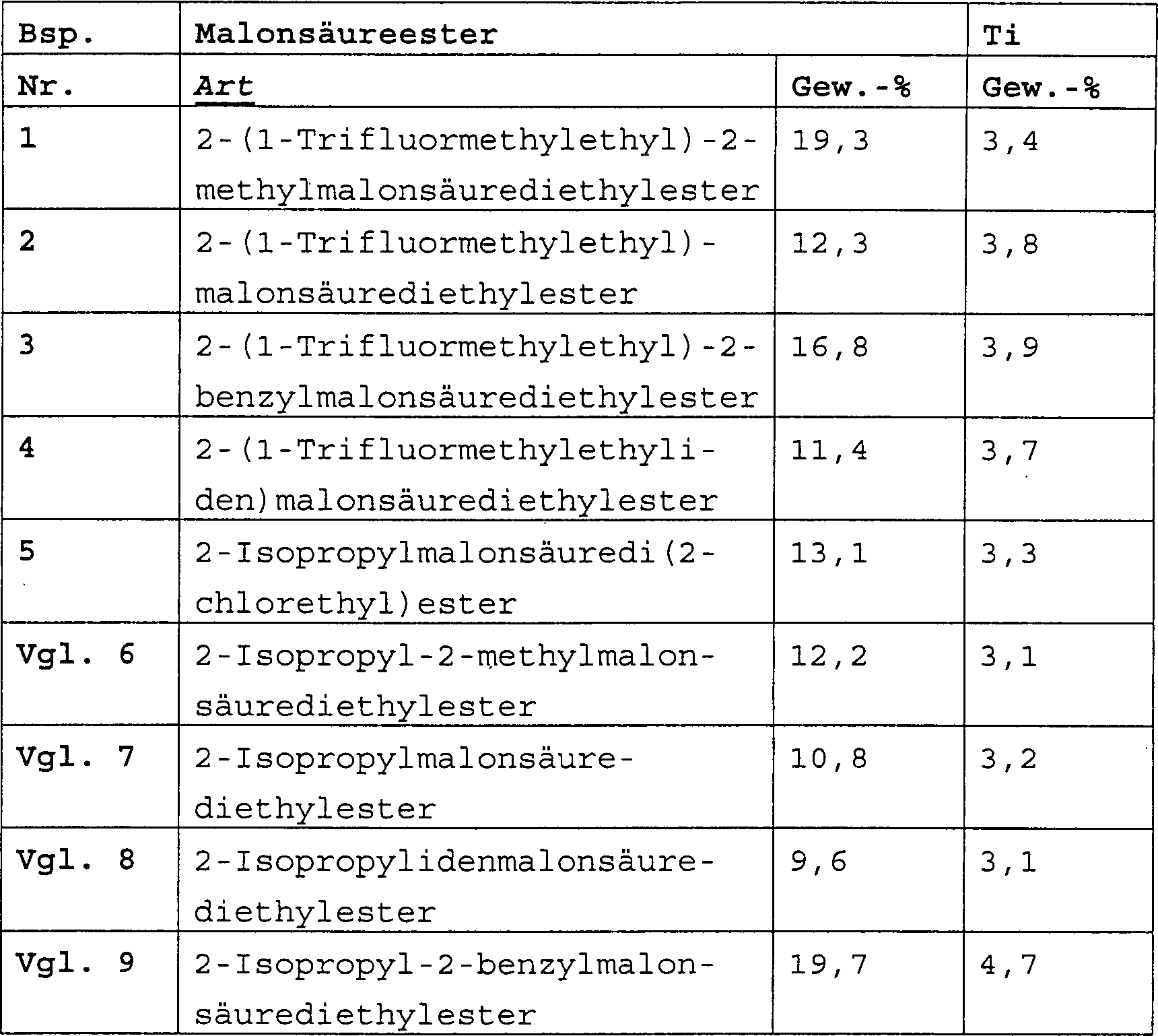 Ti, Mg, Halogen und eine unter Estern von Malonsäuren (heteroatomhaltigen Malonsäureestern)