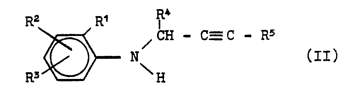 - N-propargyl anilines of the formula (II) in which R 4 is methyl can also be obtained under pressure by reacting the corresponding anilines with acetylene in the presence of copper acetylide (cf. Liebigs Ann. Chem. 596, 1 (1955) ).
