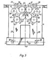 - FIG. 2 shows a variant of the printing unit 2 according to the invention, a twelve-cylinder printing unit 3. Arrangement of the cylinders, their starting and stopping and their drive in the + ) (see Fig. 3) The basic printing unit 4 and the first tier printing unit 6 are carried out exactly as described for FIG. 1.