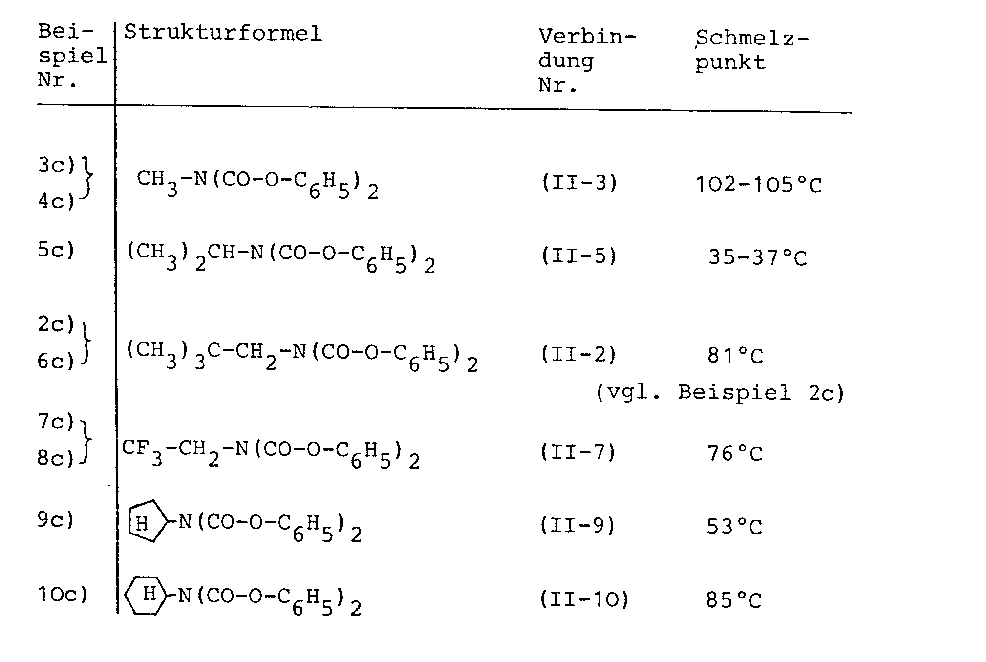- N-substituted imidodicarboxylic acid diaryl esters (II) which can be used according to the invention are: The same or mixed phenyl, 2-chlorophenyl, 4-chlorophenyl, 4-methylphenyl, 4-methoxyphenyl, 4- Nitrophenyl, 1-naphthyl or 2-naphthyl esters of methyl, ethyl, 2-chloroethyl, 2,2,2-trifluoroethyl, propyl, isopropyl, tert-butyl, sec, butyl, Isobutyl, pentyl, isopentyl, neopentyl, 1-ethylpropyl, 1,2,2-trimethylpropyl, 2-ethoxymethyl, 2-ethylmercaptoethyl, ⁇ -cyanohexyl, allyl, propargyl, cyclopropylmethyl, cyclopentylmethyl -fluor