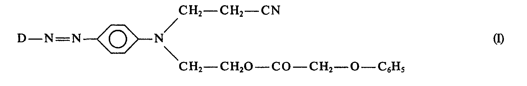 - Another possible representation for the individual dyes is that dyes of the formula VII by diazotizing D-NH 2 and then coupling onto N- ⁇ -cyanoethyl-n- ⁇ -hydroxyethylaniline of the formula VIII produces in a known manner and the dyes of formula VII for the introduction of the phenoxyacetyl radical with suitable phenoxyacetylating agents, such as. As phenoxyacetyl chloride, and to introduce the acetyl radical with a suitable acetylating agent, such as. B. acetyl chloride or acetic anhydride.