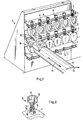- FIG. 1 three rows of workpiece holders 2, 3, 4 are arranged in a magazine 1 in the form of spaced double plates, which have a plurality of recesses 5 that are open on one side for hanging the workpieces 7 fastened to bolts 6.