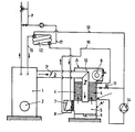 - main condenser 12 is placed on the boiler hot water return with countercurrent operation. Going from its ends, main condenser 12 exhibits at the top the hot (Freon) gas intake connection, compressor 14 is placed on duct 13. Hot water outlet connection 15 is placed above liquid Freon connection 16 and cold water heating intake connection 17.