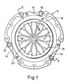 - a pressure plate 13 is driven for rotation with the cover 11 by sets of tangential straps 14 which are riveted to lugs 15 on the pressure plate 13 and to the cover 11.