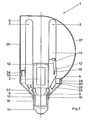 - the diameter of the cylindrical edge 25 is adapted to the diameter of the upper hollow cylindrical shoulder 19 or 20 in the base part 4, the locking lugs 24 snap into the corresponding grooves 21 and produce a simple and firm connection between the base part 4 and the protective hood 5 or 6.