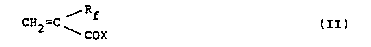- Examples of the compound of formula (II) include alpha-trifluoromethylacrylic acid, alpha-pentafluoroethylacrylic acid, alpha-heptafluoropropylacrylic acid, alpha-heptafluoro-isopropylacrylic acid, alpha-nonafluorobutylacrylic acid, alpha-nonafluoro-isobutylacrylic acid, alpha-nonafluoro-sec-butylacrylic acid, alpha-nonafluoro-tert-butylacrylic acid, alpha-perfluoropentylacrylic acid, alpha-perfluoroheptylacrylic acid, alpha-perfluoro- octylacrylic acid, and the corresponding halides such as the chlorides and bromides thereof.