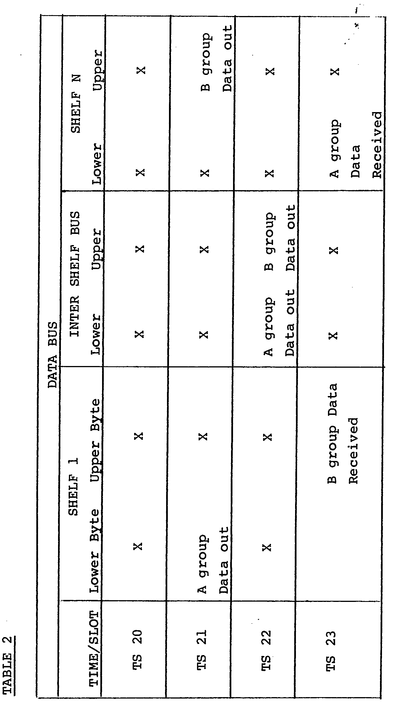 - the data stored in the receiver 204 is output on the intershelf bus 112 and a "cross over" of data occurs with data A being received by shelf interface 106 (N) and data B being received by shelf interface 104 (1). (-see Tables 1 and 2).