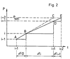 - Die sich durch Anwendung des einprogrammierten Bildungsgesetzes ergebenden Regelschritte veranschaulicht das Diagramm in Fig. 2, in dem der Reifendruck p über der Füllzeit t aufgetragen ist. Der Punkt A bei (i-1) gibt den Ausgangszustand des Reifens nach dem Anschließen des Reifenfüllgerätes an. Der erste Füllvorgang, ein sogenannter Probeschuß, erfolgt in einem fest vorgegebenen Zeitintervall to = const. Er bewirkt in dem Reifen eine Erhöhung des Druckes auf den Punkt B mit den Koordinaten i. Für den zweiten Füllvorgang ermittelt die Regeleinrichtung nun anhand des Bildungsgesetzes das Zeitintervall, bei dem bei pro Zeiteinheit fortschreitend gleichbleibender Druckerhöhung der Solldruck theoretisch bereits mit diesem Füllvorgang erreicht sein müßte. Daraus ergibt sich folgendes Zeitintervall: