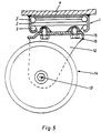 - FIG. 5 shows a swivel castor attached to a swivel bearing pot 1, the fork 12 of which carries the roller wheel 14 which can be rotated about the axis 13 and is fastened to the swivel bearing plate 2 by means of screws 16 penetrating its back 15.