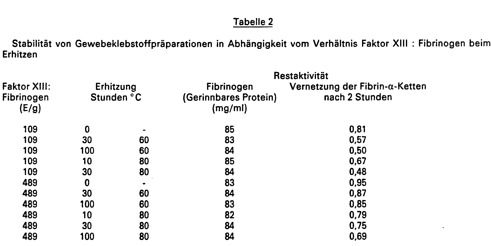 - the residual activity ie the content of intact thrombin-clottable fibrinogen and the cross-linkability of the fibrin-a chains as a measure of the biological activity is determined, the freeze-dried, heated or unheated samples being dissolved with 1.0 ml of distilled water.