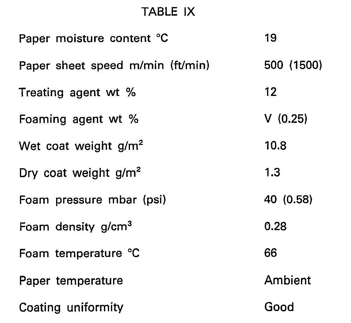 - the application describes a large class of porous substrates which may be treated with foamed treating compositions including textile fabric or a non-woven material, paper, or wood veneer. Said application is directed primarily towards, and contains specific embodiments for, a process for producing a fabric treated uniformly and which is generally essentially dry to the touch, although it is disclosed that the porous substrate need not be dry. All the specific examples treat textile fabric as the porous substrate.