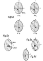 - Figure 5a represents diagrammatically the type of images (called tomographs) obtained from a series of scans of the skull when viewed along the Z axis. In the scans obtained the difference between the tumour and brain would probably not be so pronounced. If the rotating position from which the skull is viewed is to be simulated as having rotated about the Y axis from the original position then the signals representing the plane at Z 1 would be manipulated to produce the effect of this in the output image and would appear to be rather like that seen in Figure 5d. The other frames of signals would be manipulated in the same manner. Once the frame of signals have been manipulated as desired they are written into buffer store 30 and the next frame is written into cache store 23 for manipulation in the same manner.
