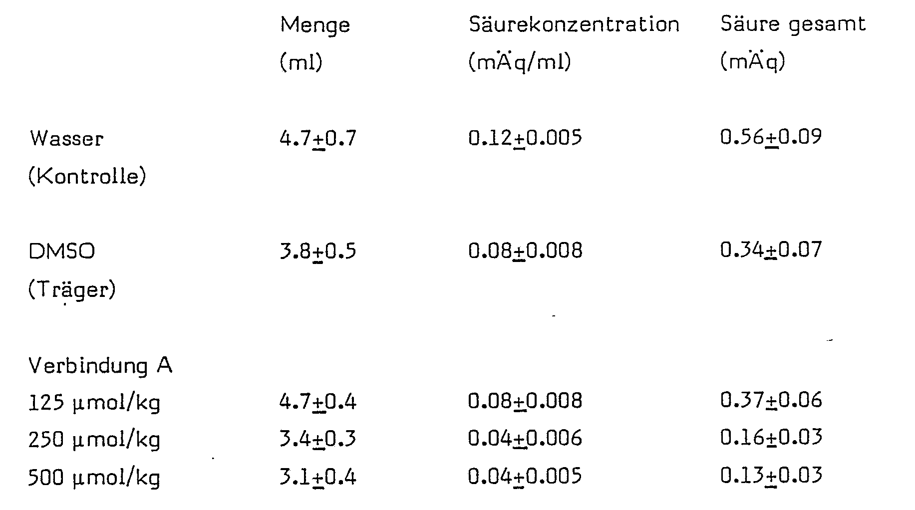 - the substances were dissolved in 20% dimethyl sulfoxide and orally administered to female rats (strain: Charles River CD) in increasing doses of 125, 250 and 500 ⁇ mol / kg with the uniform dosage volume of 20 ml / kg. 60 minutes later, the animals were subjected to pylorus ligation. 4 hours after setting the pylorus ligation, the acid concentration and the total acid content in the stomach volume of the animals were determined.