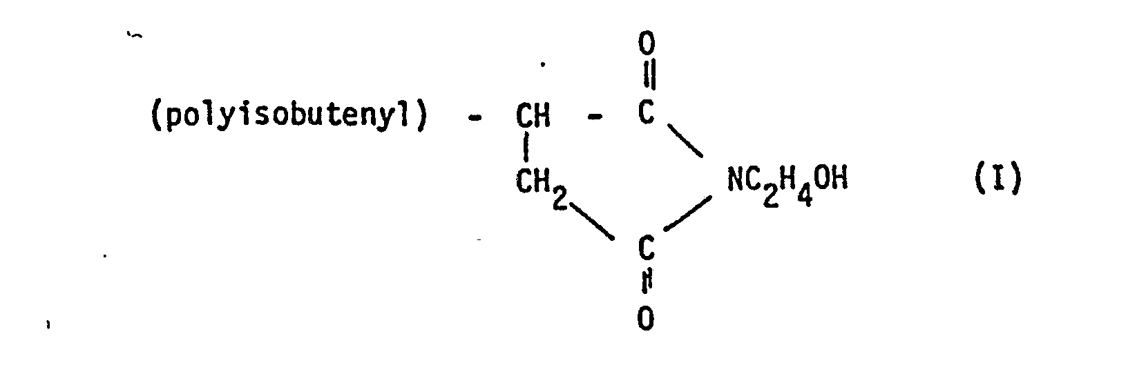 - the imide according to Formula (I) can naturally be used in its pure form, it is in fact usually a product obtained by a reaction of the type described above between poly(isobutenyl)succinic anhydride and monoethanolamine, which gives rise to a mixture consisting predominantly of the imide of formula (I), but also containing diamides, acid amides, etc.