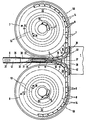- a storage drum device known per se is provided on both sides of the separating region of the strands, such that both storage drums each have a rotary bearing, at least with regard to their base, on which the embedded strand is deposited in a spiral course.