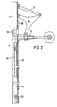 - Die (beispielsweise) Abschwenkung der schwenkbaren Führungsschiene 6 über einen hydraulischen Zylinder 14 mit zugeordneter Kolbenstange 15 ist Gegenstand der zum Std. d. T. gemäß Art. 54.3 EPÜ gehörenden älteren Patentanmeldung EP-A 192 170 der Anmelderin. Der hier achsparallel zur teleskopierbaren Führungsschiene 5 angeordnete hydraulische Zylinder 14 stützt sich unterseitig an dem Befestigungspunkt 23 ab, während seine Kolbenstange 15 biegefrei in einer Führung 24 geführt ist. Am oberen Ende der Kolbenstange 15 ist über einen Hebel 39 ein dreiarmiger Hebel 16 angelenkt, welcher sich mit seinem einen Ende an der Radstütze 13 und mit seinem anderen Ende an einem weiteren Hebel 17 gelenkig abstützt, welcher seinerseits schwenkbar an der schwenkbaren Führungsschiene befestigt ist. Es ist ersichtlich, daß sich bei der Darstellung nach Fig. 2 das nicht dargestellte Gebäude in der Bildebene rechts befindet, so daß sich die Radstütze 13 daran abstützen kann. Bei Beaufschlagung des hydraulischen Zylinders 14 im Sinne "Kolbenstange einfahren" wird sich die schwenkbare Führungsschiene 6 in in der Bildebene linksdrehendem Sinne soweit abschwenken, bis sie in etwa der teleskopierbaren Führungsschiene 5 anliegt. Sie gelangt dabei in die in der Fig. 1 dargestellte Verstauposition 20.