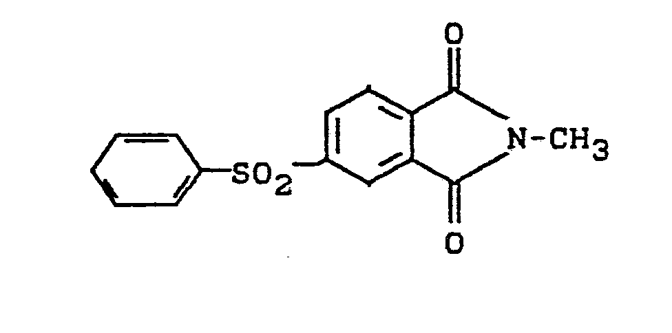 - 10,95 g Natrium-p-toluolsulfinat (76,7 Xig) und 10,35 g 4-Nitro-N-methylphthalimid werden in 100 ml wasserfreiem DMF 24 h zum Rückfluß erhitzt. Nach Abkühlen wird filtriert und die Mutterlauge in Wasser gegeben. Man erhält 4 g eines Rohproduktes, das an seienm Schmelzpunkt (187-189°C nach Umkristallisieren aus Essigsäure) und seinen spektroskopischen Daten als identisch mit dem Produkt des Beispiels 2 identifiziert wird (4-(p-Tolylsulfonyl)-N-methylphthalimid).