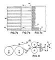 - An elongate sheet of liner 34 is fed from a second roll 28 to a laminating station 36 where it is joined into a laminate 38 with the face stock, the adhesive strips 32 interposed between the face stock and the liner as shown in FIGS. 6 and 7b.