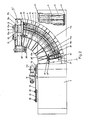 - the first magazine includes or is connected to a downfeed section located on the recoil jacket of the gun, this downfeed section being angled in relation to the fan-shaped magazine.