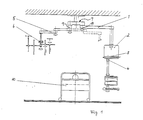 - the ceiling column 16, the adjoining transverse part 12 of the base part 7, the two lugs 20 and 22 and the stand arms 1, 5 connected to them are each hollow, so that supply lines such as electrical leads 25, Lines for gases 26 and the like can be guided from an intermediate space between the raw ceiling 13 and an intermediate ceiling 24 through the interior of the ceiling column 16 into the base part 7, to the respective extensions 20, 22 and through this into the stand arms 1, 5.