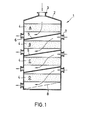 - the flow guidance then corresponds to this sequence, ie the gas flowing in at 3b leaves the device 1 after flowing through the tray “A” at 6a, 6b the device 1b flows through a heat exchanger 9b and enters, which is indicated by the arrow 7b, from into the horde "B” above. The further gas flow then results from the arrows shown in the figure.