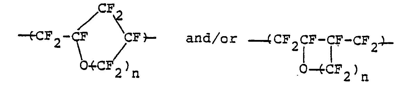 - The group (a) of the repeating units according to the present invention can be obtained by fluorination of a partially fluorinated vinyl ether, for example, CF2 = CF-O-CF2CF2-CH = CH2, after it has been subjected to the cyclic polymerization. Preferably, however, the group (a) of the repeating units can be obtained by subjecting perfluoroallyl vinyl ether (hereinafter abbreviated as "PAVE") or perfluorobutenyl vinyl ether (hereinafter abbreviated as "PBVE"), which is represented by the following general formula: