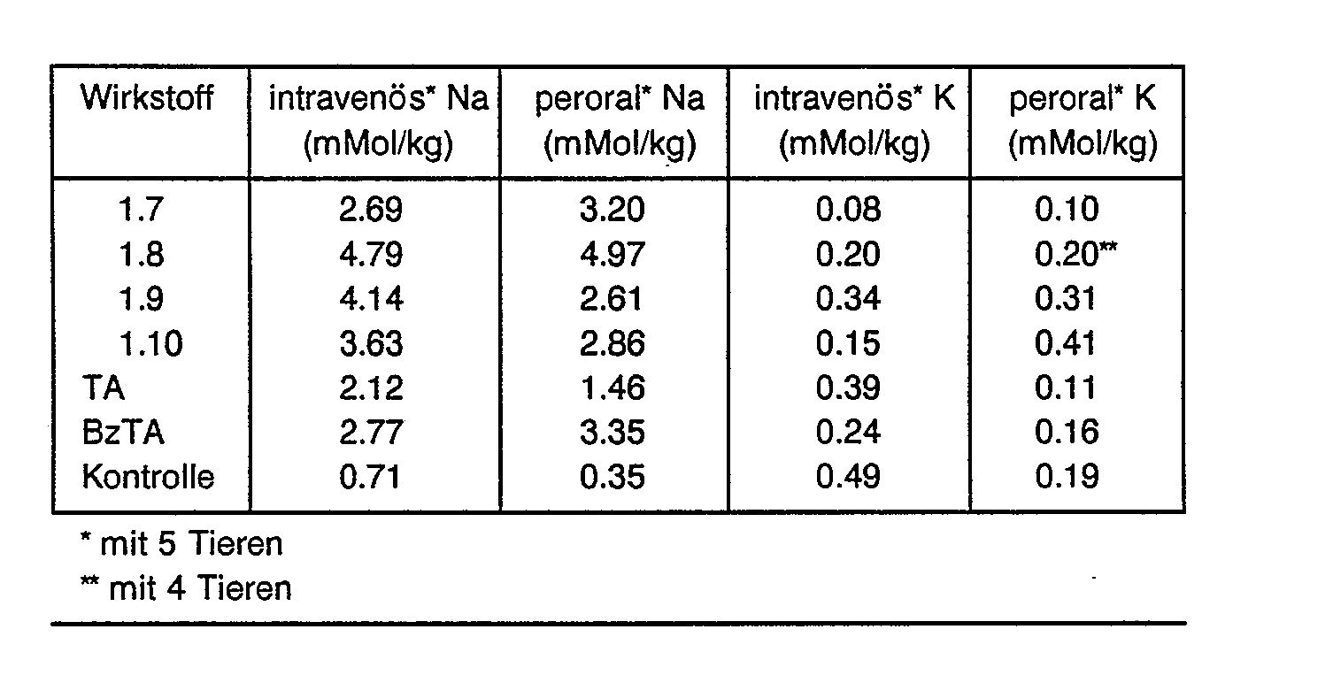 - Für die Versuche wurden männliche Wistar-Ratten mit etwa 130 g Körpergewicht verwendet, denen für 18 Stunden das Futter entzogen worden war. Sie erhielten unmittelbar vor der intravenösen Applikation der Testsubstanz oral eine Menge von 20 ml/kg 0,9 %ige NaCI-Lösung zugeführt. Die intravenöse Applikation betrug 0,001 bis 300 umol Wirkstoff in 4 ml/kg 0,9 %iger NaCI-Lösung (pH 3). Appliziert wurde unter leichter Ethernarkose in die Schwanzvene. In der Regel wurden pro Versuch sechs Versuchstiere eingesetzt. Die peroale Verabreichung geschieht mittels Schlundsonde in den gastrointestinalen Bereich. Die Tiere wurden einzeln in Diuresekäfige gesetzt und der Harn nach 2,5 Stunden aufgefangen. Die Bestimmung der Elektrolyte (Na+/K+, Mg+2) erfolgte flammenphotometrisch und durch Atomabsorptionsmessung mit dem Elektrolyt-Automat FL6 der Fa. Zeiss/Oberkochen.