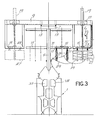 - a slide 21 is movable transversally to the longitudinal extension of the guide 7 for each front of spindles 3A, 3B, said slide carrying a cylinder-piston system 19 for the handling of frames 15 in a manner described below.